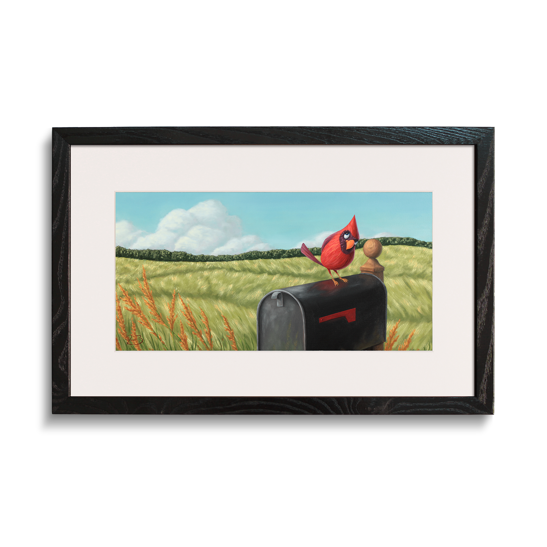 ‘Cardinal on a Mailbox’ is a print of an original painting of a stylized cardinal perched atop a mailbox in front of fields of grass.