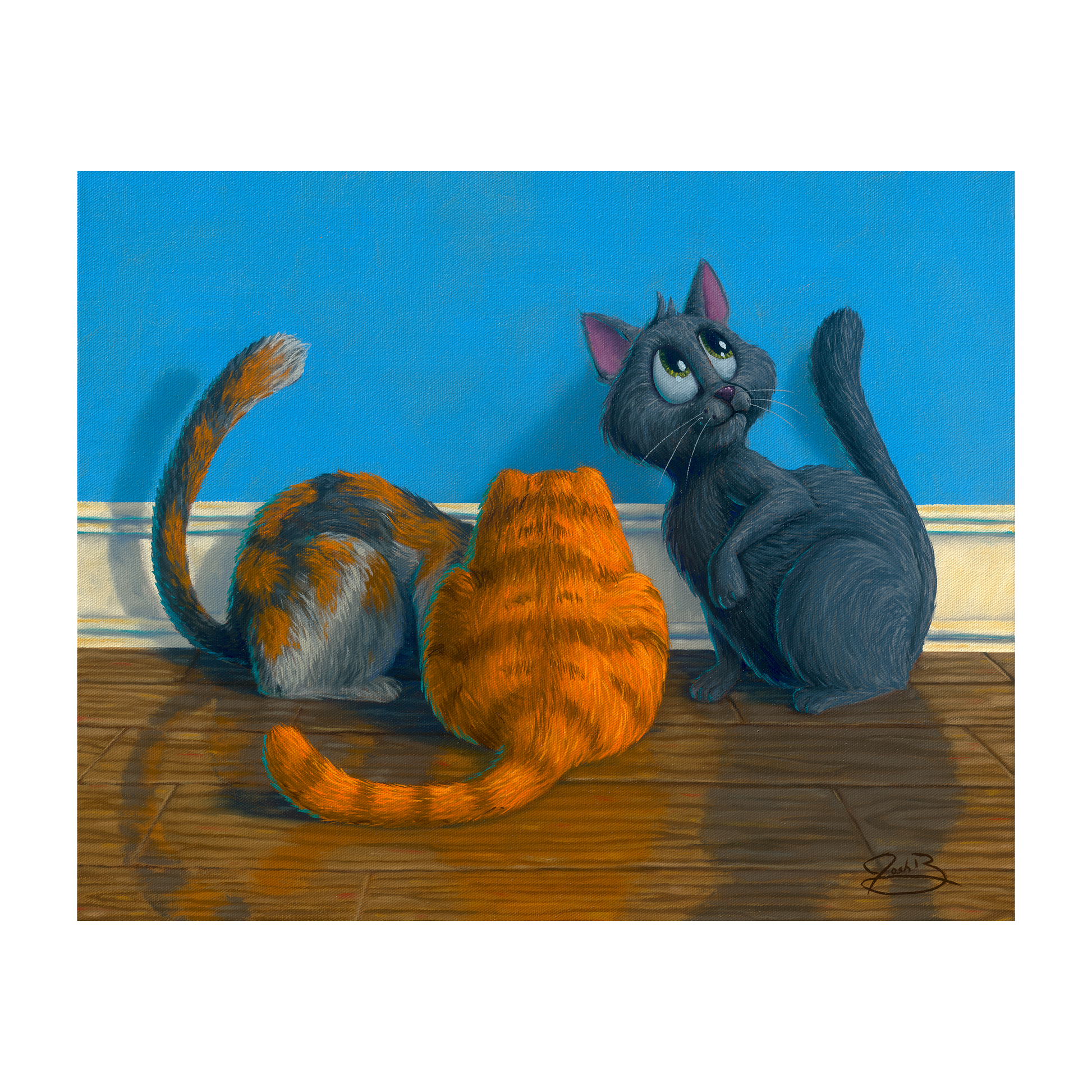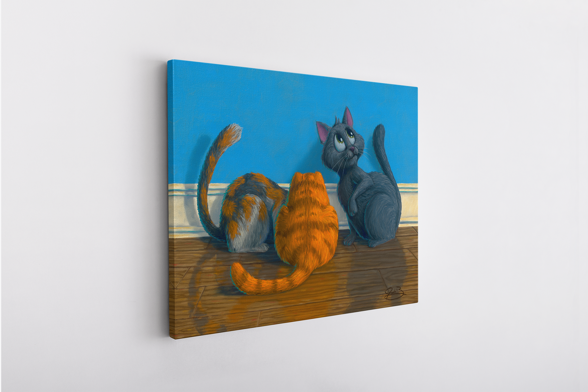 ‘Waiting For A Mouse’ is a about 3 cats waiting at the hole in the wall for the mouse to emerge.