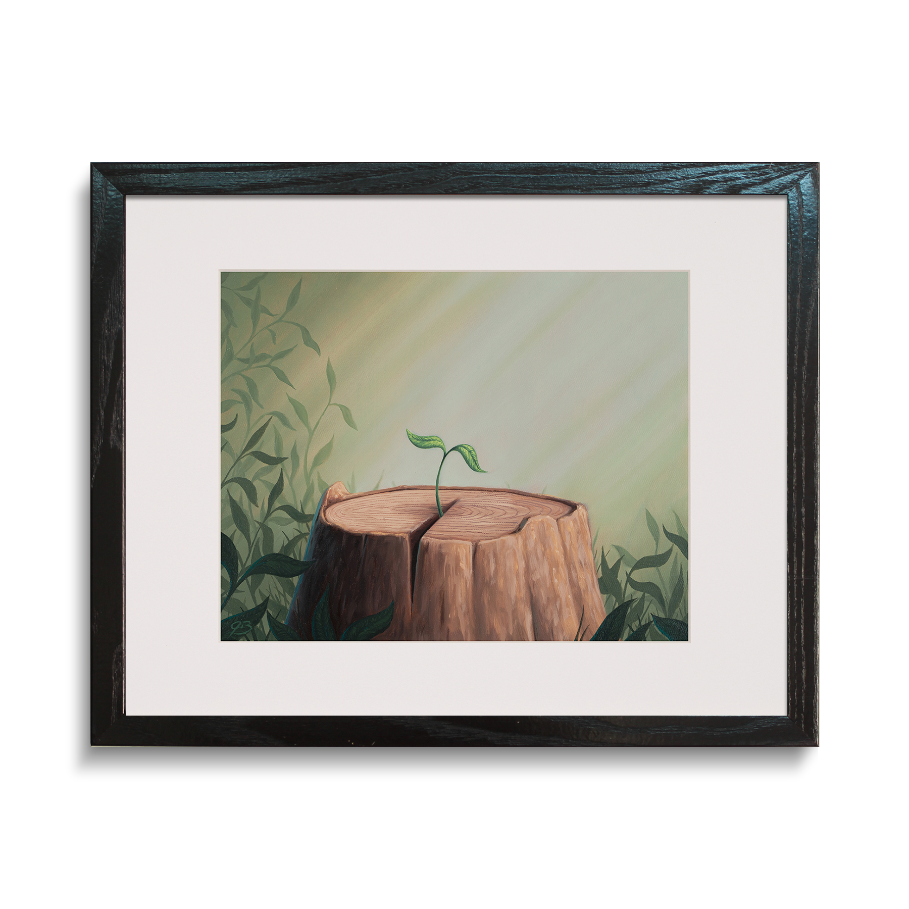 ‘New Beginnings’ is a print of a painting about the resilience and persistence of nature. It shows a vibrant sapling growing from a weathered tree stump.