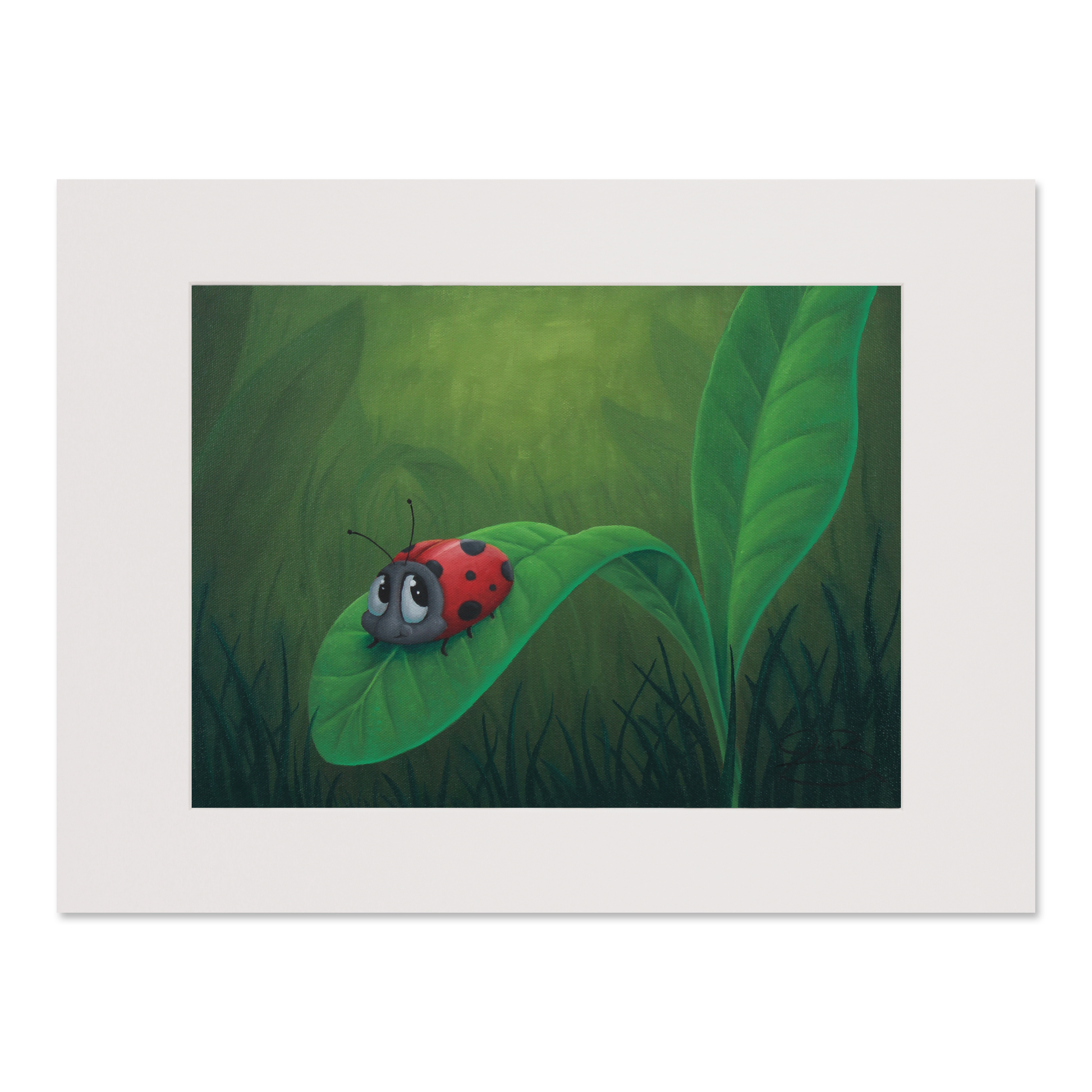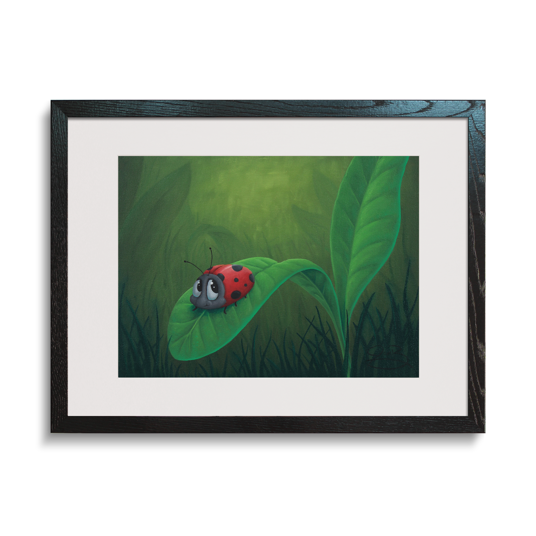 ‘One Leaf at a Time’ is a print of a painting of a stylized ladybug going from leaf to leaf one at a time.